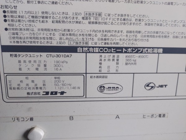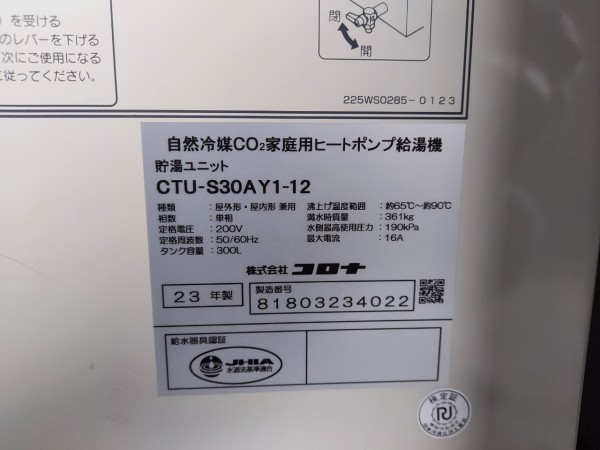 川越市青柳 コロナ自然冷媒CO2家庭用ヒートポンプ給湯機貯湯タンクユニットCTU-301DA7、貯湯ユニットCTU-S30AY1-12 エコキュート交換工事