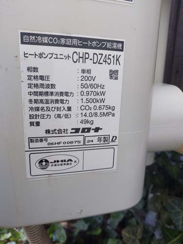 鶴ヶ島市高倉 コロナ自然冷媒CO2家庭用ヒートポンプ給湯機 貯湯ユニットCTU-37AZ1K、ヒートポンプユニットCHP-DZ451Kエコキュート交換工事