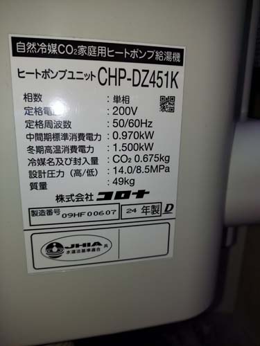 熊谷市善ケ島 コロナ自然冷媒CO2家庭用ヒートポンプ給湯機 ヒートポンプユニットCHP-DZ451K エコキュート交換工事