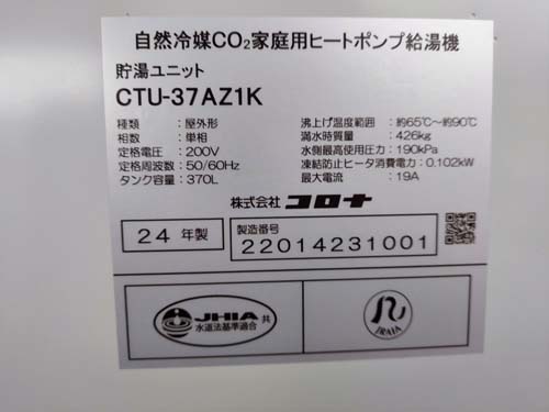 桶川市小針領家 コロナ自然冷媒CO2家庭用ヒートポンプ給湯機貯湯ユニットCTU-37AZ1K、ヒートポンプユニットCHP-DZ451K エコキュート交換工事