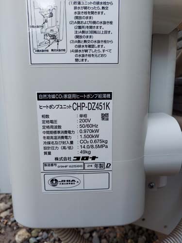 熊谷市押切 コロナエコキュート→コロナ自然冷媒CO2家庭用ヒートポンプ給湯機 ヒートポンプユニットCHP-DZ451K エコキュート交換工事