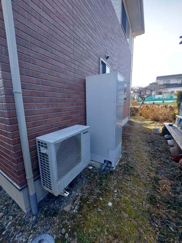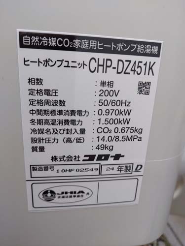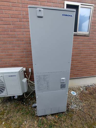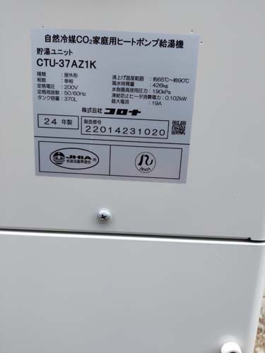 桶川市篠津 コロナ自然冷媒CO2家庭用ヒートポンプ給湯機貯湯ユニットCTU-37AZ1K、ヒートポンプユニットCHP-DZ451K エコキュート交換工事