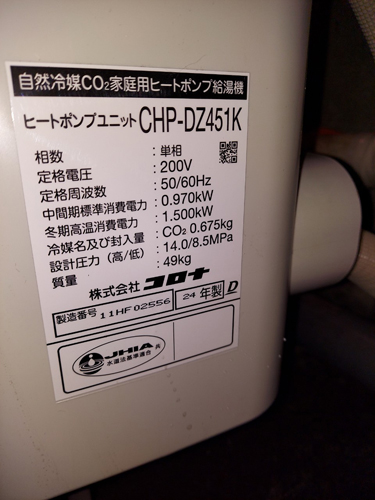 入間市野田 コロナ自然冷媒CO2家庭用ヒートポンプ給湯機 ヒートポンプユニットCHP-DZ451K エコキュート交換工事|埼玉県のエコキュート専門交換工事店|埼玉エコキュート交換ショップ補助金対応可能